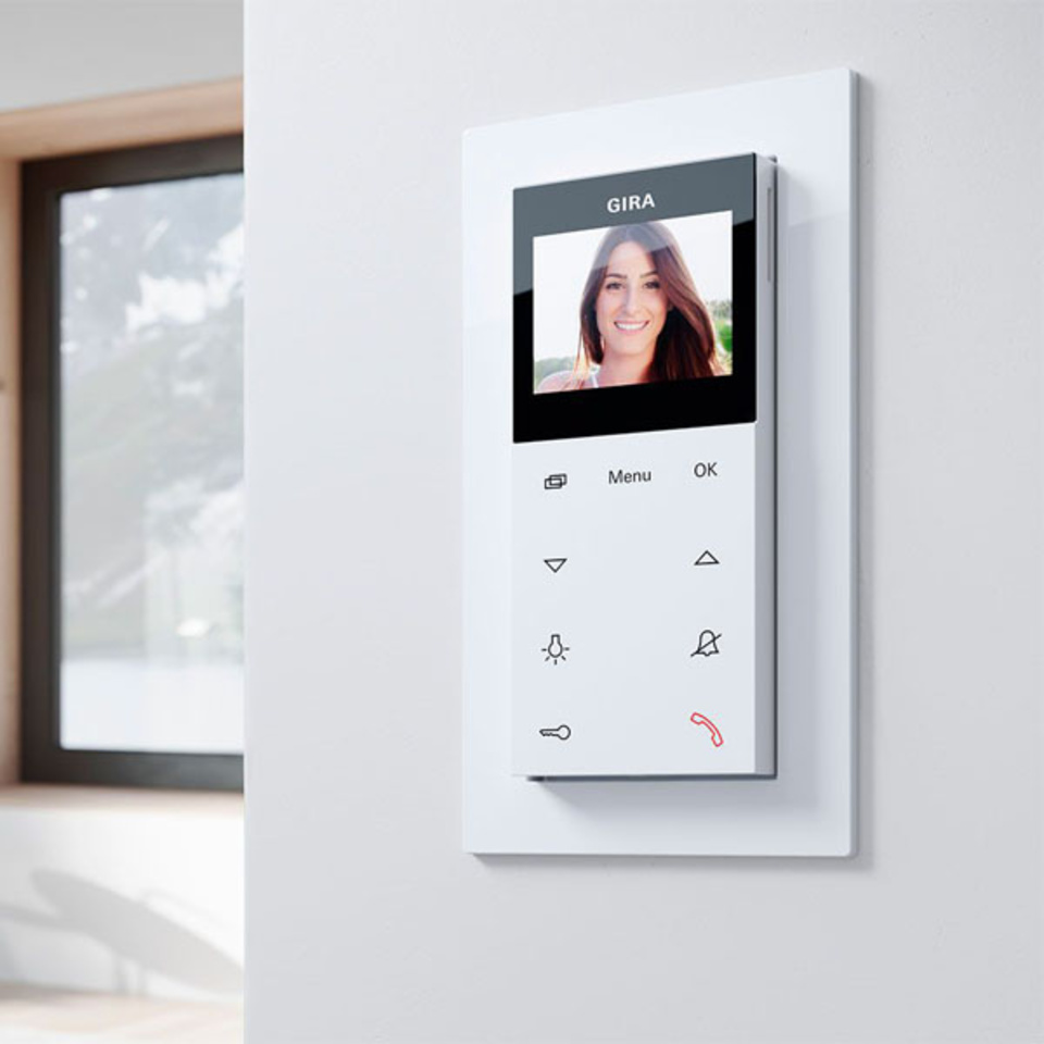 Die Gira Wohnungsstationen bilden das Gegenstück zu den Gira Türsprechanlagen im Außenbereich.