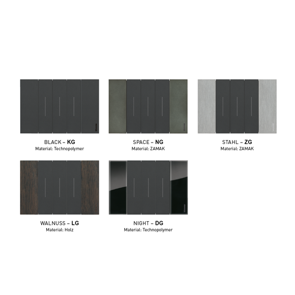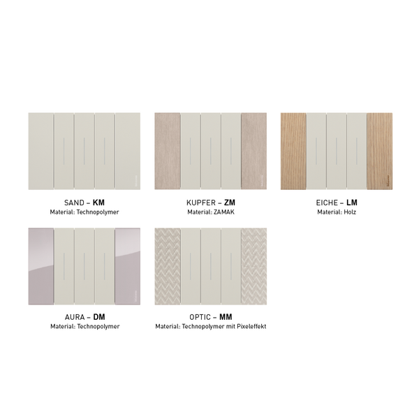 - 3 Farben für die Abdeckungen: Die Abdeckungen, wie z. B. Wippen und Steckdosenfrontblenden, sind in 3 verschiedenen Farben erhältlich: White, Sand und Black. Die satinierte Oberfläche sorgt für ein angenehmes Bediengefühl.